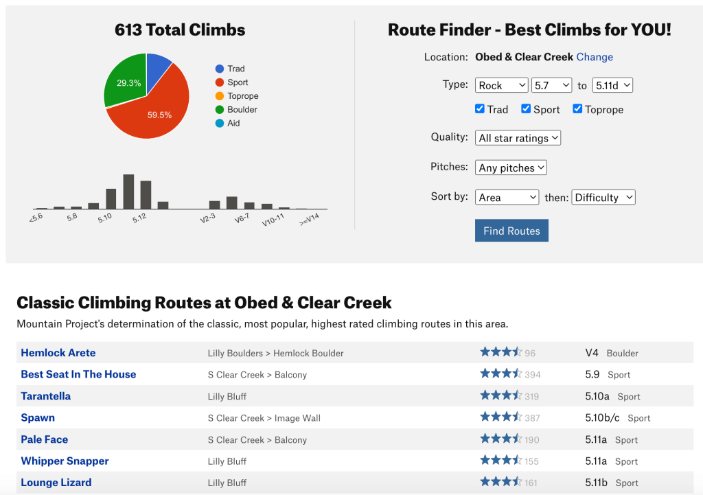 Mountain Project is the biggest climbing website in the USA, with some limited coverage of foreign climbing destinations. The main MP website functions as a semi-open wiki, with climbers encouraged to submit area and route information, descriptions and photos. Submissions are moderated by regional admins, and some areas are purposefully kept off Mountain Project. Users can comment on specific routes or areas to share beta, and the website also has an active forum section.